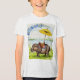 The image is a watercolor illustration of a hippopotamus with a saddle and a yellow umbrella. The hippopotamus standing next to water, with mountains in the background and blue flowers framing the scene.