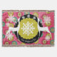 Die schöne Weihnachtsbaumdecke mit einem Hintergrund aus heiß rosa mit weißen Schneeflocken und Schneeflocken, einem Ring aus massivem Schwarz mit ein paar weißen Schneeflocken, und einem Zentrum aus Senfgelb mit winzigen weißen Polka-Punkten und einem großen Schneeflocken-Zentrum. Zwei weiße Silhouetten schmücken diesen hübschen Urlaubsknofen und es gibt eine Gegend, die Sie ganz einfach mit Ihrem Familiennamen persönlich gestalten können.