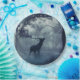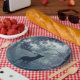 Teller aus Papier mit einem Foto eines Regalhirsches mit Geweih stehend in einem schattigen Wald unter sonnenbeleuchteten Bäumen. Rund um den Schnee fallen.