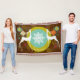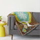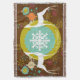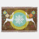 Die schöne Weihnachtsdecke mit dunkelbraunem Hintergrund mit bunten Schneeflocken, einem Ring aus massivem Senfgelb und einem Zentrum aus Aqua-Blau mit winzigen weißen Polka-Punkten und einem großen Schneeflocke-Zentrum. Zwei Silhouetten Hirsche und hübsche Baumschmuck schmücken diesen skurrilen Urlaubsknofen und es gibt einen Bereich, den Sie mit Ihrem Familiennamen ganz einfach persönlich gestalten können.