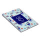Ein Spiralheft mit einem sich wiederholenden Muster. Illustriert mit einem blauen skandinavischen Hirsch mit roten Schals. Mit dekorativen Markierungen auf ihren Körpern. Neben einem Trio aus roten und blauen Weihnachtsbäumen mit einem Stern auf der Oberseite. Extravagante Schneeflocken sprengen herum. Ein Quadrat oben mit Ihrem personalisierten Monogramm Initial und Name.