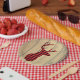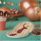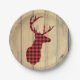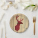 Teller aus Papier im rustikalen Stil. Designed mit einem Hirschkopf mit Geweih, aus rot kariert. Ein Bild von Holzplanken für das Hintergrundbild verleiht ihm ein ausgesprochen ländliches Ambiente.