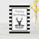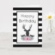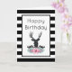 Herzlichen Glückwunsch zum Geburtstag Grußkarte mit einer personalisierten Nachricht innen. Designed mit einem schwarzen Hirschkopf mit großen Geweih. Geometrische Linien im Hirschgesicht fügen eine kreative Touch hinzu. Farbenfrohe rosa Blume und minzgrüne Blätter bilden einen hübschen Blumenstrauß unter seinem Kopf. Eine Gebirgskizze inmitten der Blume trägt ebenfalls zum rustikalen Landgefühl bei. Hintergrund ist ein schwarz-weiß gestreiftes Muster.