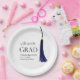 Dekorieren Sie Ihre Graduierungsparty mit diesen sauberen, minimalistischen "Hats Off To The Grad"-Tellern, die eine tiefblaue und goldene Abschluss-Tassel und eine elegante Typografie enthalten.