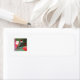 Ein Kolibri trägt eine Weihnachtsmannmütze und ist bereit, den Weihnachtsweihnachtsbaum, der von seinem Schnabel an einem roten Zubringer hängt, aufzuhängen. Der Kolibri ist Sprichwort, "Ho Ho Ho".