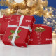 Moderne, lustige und niedliche Weihnachtsverpackung, mit einem Bild eines Einhorns, der den Schlitten des Weihnachtsmanns (voller Geschenke) zieht, den Texten "Ho ho hoh lieber, was für ein Jahr!" + "Hier ist ein glücklicheres!" + "Frohe Weihnachten!" und einem personalisierten Namen. Mit Sprinklen von weißen und silbernen Schneeflocken und zwei Paaren von Weihnachtsglocken mit einer Quelle von heilig, auf einem Weihnachtsrot Hintergrund. Stellen Sie sicher, dass Sie zumindest den Namen personalisieren.