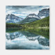 Dieses Foto spiegelt einen See in Alberta, Kanada im Schatten der schneebedeckten kanadischen Rockies wider.