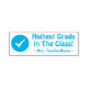 Dieses positive Gummi Briefmarke Design beinhaltet die ermutigende Rückmeldung "Höchster Grad in der Klasse!" und den Namen eines angepassten Pädagogen. Es verfügt auch über ein dekoratives Karo-Symbol. Es könnte von einem Lehrer, Lehrer, Lehrer oder Tutor genutzt werden, um anzuerkennen, dass ein Schüler gut abgeschnitten hat.