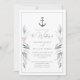 Genießen Sie die natürliche Schönheit der Küste mit diesem Laub und Anker Hochzeitseinladung. Dieses Design mit zartem Laub Akzenten an den Seiten und einem eleganten Ankermotiv an der Spitze, erweckt das Wesen maritimer Romantik. Das gedämpfte, grau-blaue Farbkonzept verleiht dem Meer eine Touch von Eleganz, während die Wasserstreifen auf der Rückseite zeitlose Eleganz hervorrufen.