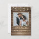 Ihr Foto auf der Vorderseite ist mit einem rustikalen, landschaftlichen, braunen, verwitterten Holzputz-Hintergrund und weich gelben Glühkerzen Lichter, zusammen mit dem Titel von LIEBE & DANKS und Ihrem Hochzeitstag in einem Land Western handgedruckt Schriftart und Ihren Namen in einem groben Bürstenskript-Schriftart. Auf der Kartenrückseite befindet sich ein weiteres Foto und es ist möglich, eine allgemeine Danksagung einzugeben (oder den Beispieltext zu löschen, um für persönliche handgeschriebene Dankeschön-Noten leer verlassen). FOTO TIPP: Wählen Sie vor dem Hochladen ein Foto mit dem Thema in der Mitte und/oder schneiden Sie es auf eine quadratische Form vor. Kontaktieren Sie den Designer über den Zazzle Chat oder makeitaboutyoustore@gmail.com , wenn Sie möchten, dass das Design verändert oder koordinierende Elemente gewollt werden.