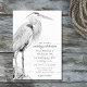 Diese Hochzeitseinladung zeigt einen Stift, der von einem wunderschönen, auf Felsen mit Blick auf das Wasser stehenden Großen Blauen Helden zeichne. -