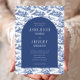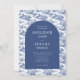 Diese Einladung zeigt ein blau-weißes Muster in der Nachahmung der antiken französischen Jouy-Toile, das Landschaftsvignetten von Gebäude und Bäumen darstellt. Der Text erscheint in Weiß auf einem marineblauen Bogen. Der Rücken wiederholt das blau-weiße Fliesenmuster.