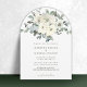 Eleganter Ivory Watercolor Blumenbogen Hochzeit Einladung mit weicher Vegetation und Elfenbeinblüten an der Spitze und moderne Weise grün Drehbuch auf einem weißen Hintergrund. Diese minimalistische Einladung verströmt zeitlosen Charme, ideal für rustikale, Land, Winter, Frühling, Sommer, klassische, weiße und traditionelle Hochzeiten. Individuell gestaltbares Design, hochwertiger Druck - Fügen Sie Ihre Namen, Ihr Hochzeitstermin und Ihren Veranstaltungsort in einem anmutigen Layout hinzu.