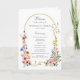 Die goldgelbe Bogen-Ränder mit eleganten Rollen, die mit romantischen bohenhaften, pastellfarbenen Wildblumen in blassblau, rosa und gelb verziert sind. Enthält auch eine Fotovorlage. Diese charmante Kollektion ist die perfekte Ergänzung für Ihre Hochzeit im Frühjahr, Sommer oder im Garten.