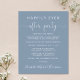 Günstige staubblaue Gestaltung oder kleinere Hochzeitsankündigung und Empfang- oder Feierlichkeiten Party Einladung. Die Vorderseite zeigt "Happily Ever After Party" in einer Mischung aus weißer Typografie und einem eleganten weißen Drehbuch mit Swashes. Sie können Ihre Nachricht und Einladung detaillierter gestalten und Ihre Namen in einem signaturähnlichen Skript angeben. Auf der Rückseite finden Sie Ihre Vornamen und das Hochzeitstermin.