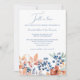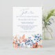 Diese romantische Hochzeitseinladung bietet ein Blumenthema im Herbst in staubigen Blau-, Beige- und Kupfertönen. Blume, Beeren und Herbst-Blätter werden entlang des unteren Teils platziert, um einem wilden Garten zu ähneln. Kleine blaue Beeren sind mit kupferfarbenen Blume und rostfarbenen Blätter eingefasst.