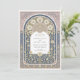 Diese exquisite Hochzeitseinladung zeigt ein atemberaubendes Design, das tief in den Kunstwerken und Jugendstil-Bewegungen verwurzelt ist. Die raffinierte Farbpalette besticht durch staubige Blues, gedämpfte Cremes, helle Gelbtöne und sanfte Braun und schafft ein Vintages und zeitloses Ambiente. Der äußere Rand zeigt ein zartes Muster in Blasslila, Rosa und Blau. Die zentrale Gewölbewand ist mit stilisierten botanischen Motiven geschmückt. Hervorragende creme- und blassgelbe anemonartige Blume, oder vielleicht stilisiertes Dogwood oder Hellebore, mit aufwändig detaillierten Zentren, sind ein wesentliches Merkmal. Ergänzt werden sie durch kleinere, zauberhafte, blassgelbe Blüten und Haufen winziger Blume mit blauen und weißen Akzenten, die an vergessene Noten erinnern, die alle mit blass gelbem und staubblauem Blattwerk verwoben sind. Das Design ist reich an komplizierten Mustern, darunter ein dekoratives Medaillon über dem Textbereich, und Schichtenränder, die geometrische Präzision mit Bio, fließenden Linien verbinden. Das Gesamtbild ist von raffinierter Eleganz, künstlerischem Kunsthandwerk und romantischem Vintagem Charme geprägt, ideal für Paare, die ein detailliertes und zeitloses Design schätzen. Die Rückseite bietet einen dedizierten Platz für "The Finer Details", wobei die elegante Ästhetik beibehalten und alle notwendigen Informationen wunderschön präsentiert werden.