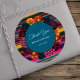 Mit diesem modernen mexikanischen Blume Wedding Round Sticker fügen Sie Ihrem Hochzeitsgeschenk eine lebendige Touch hinzu. Mit einem kühnen Blumenrahmen in lebhaften Rot-, Rosa-, Gelb- und Grüntönen strahlt das Design mit fröhlicher Energie aus, die von der traditionellen mexikanischen Kunst inspiriert wird. Ein farbenfroher gestreifter Hintergrund, der an mexikanische Textilien erinnert, fügt einen spielerischen und dennoch modernen Kontrast hinzu. Dieser Rundaufkleber ist perfekt zum Abdichten von Umschlägen, zum Verpacken von Vorzügen oder zum Hinzufügen personalisierter Details in Ihr Dekor geeignet und vereint festlichen Flair mit zeitgenössischer Eleganz, die sich ideal für ein farbenfrohes, kulturelles und Liebe-Fest eignet.