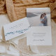 Dieses elegante Sommerdesign für moderne Hochzeiten am Strand, minimalistische Feiern an der Küste oder schicke Abendessen an der Probe bietet eine Schule von blauen Aquarellfischen, die am Boden schwimmen. Personalisieren Sie mit zwei Textzeilen in klassisch marineblau Schrift, fügen Sie dann ein Foto und eine persönliche Nachricht in das Innere.