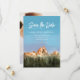 Rustikale Save the Date-Karte mit Darstellung eines roten Berges mit Kiefernwald. Ideal für eine Herbst- oder Winterhochzeit.