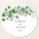 Dieser Hochzeitspapier-Untersetzer wird mit einem Eukalyptusrebe gezeigt, der einen Kunstdruck verlasst. Passen Sie dieses Element an, und ändern Sie den Beispieltext in Ihren Text. Suchen Sie nach unseren passenden Papierservietten und Tellern. Lizenziertes Bild