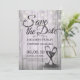 Save the Date Einladungskarten-Vorlagen Hochzeit - Elegantes Schriftzeichen, Vintage Champagnerbrille und Streichellichter auf rustikalem Holzhintergrund. Ein perfektes Design für Ihren großen Tag! Alle Textstile, Farben, Größen können an Ihre Bedürfnisse angepasst werden.