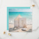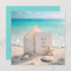 Eine leere Karte und eine Erholung auf einem Sandstrand, umgeben von Muscheln, Seestern und türkisfarbenem Meereshintergrund. Alle Texte können geändert werden.