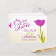 Schöner Single lila Tulpe auf creme rustikale Farbe Save the Date Hochzeit informelle Einladung. Bearbeiten Sie diese Einladung mit Ihren Worten. Einfach, modern und romantisch, ideal für eine Blume- oder Frühjahrsheirat. Design und schöne Aquarellmalerei von Sarah Trett.