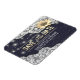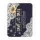 Hochzeit speichern Sie die Datums-Magnete Vorlagen - Elegante Sonnenblumen, Vintage Spitzen-Rahmen und schicke Streichelleuchten auf blauem Navy-Hintergrund. Ein perfektes Design für Ihren großen Tag! Alle Textstile, Farben, Größen können an Ihre Bedürfnisse angepasst werden.
