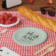 Maßgeschneiderte Grünpapier-Teller für Ihre Hochzeitsfeier und Hochzeitsfeiern mit "Mr. & Mrs." in einem großen Drehbuch und einer Illustration von zwei zusammengeschlossenen Hochzeitsringen. Fügen Sie Ihren Nachnamen und das Hochzeitdatum hinzu.