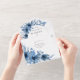 Alle in einer dreiseitigen Hochzeitseinladung mit einem Blumenstrauß aus blauem indigofarbenem Wasser in einem modernen Bogen-Rahmen Wedding Einladung, rsvp Karte und Umschlag Kombination. Die Antwortkarte ist eine perforierte Abreißkarte von rsvp mit detaillierten Wahlmöglichkeiten. Eine moderne, alles in einer Lösung, um zu verhindern, dass die beiliegende rsvp-Karte versehentlich unter den Kühlschrank kommt.