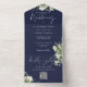 Alles in einer Hochzeitseinladung mit botanischen grünen rustikalen Blätter und eleganter Typografie auf marineblau Hintergrund. Die Einladung enthält eine perforierte RSVP-Karte mit QR-Code. Entwickelt von Thisisnotme©