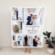 Eine individuell gefertigte Sake-Decke für Neuvermählte mit einer 9-Foto-Collage Ihres Hochzeitstages, Flitterwochen, Verlobung, etc., und Ihren Namen und Hochzeitstag in eleganter Serifentypografie. Die Hintergrundfarbe kann im Designwerkzeug geändert werden.