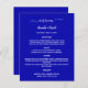 Ein klassisches Hochzeitsmenü. Ein königlich blauer Hintergrund. Weißer Text. Personalisieren Sie Ihren Namen, das Datum und das Menü und fügen Sie es hinzu. Sie können mehr Text hinzufügen, Fotos auf der Rückseite. 1 Blatt = 1 Menü, mit dem die Kante an Kante aufgedruckt ist.
