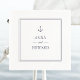 Klassische Servietten für Hochzeitspapiere mit Braut- und Bräutigamen. Weiß mit doppelnadelblauen Rahmen und Anker-Abbildung oben in der Mitte, Blocktext in marineblau.