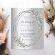 Ein Imitat silber aussehender Hintergrund. Ein ovaler silberner Rahmen mit schlängelgrüner Vegetation. Personalisieren und fügen Sie Ihre Namen, Details. Schwarzer Text. 1 Blatt = 1 Einladung mit Druckkante bis Kante.