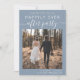 Moderne staubblaue Ankündigung Datum freihalten für Ihren Post-Eement oder privaten Hochzeitsempfang mit Ihrem Foto und "Happily Ever After Party" in einer Mischung aus schlichter weißer Typografie und einem schicken weißen Drehbuch mit Wimpern. Fügen Sie unter Ihrem Foto Ihre Vornamen und das Datum und die Position des Empfangs/Party hinzu.