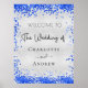Ein silbernes Imitat, mit königsblauen Konfetti dekoriert. Mit dem Text: Willkommen zur Hochzeit von. Personalisieren Sie Ihre Namen und fügen Sie sie hinzu.