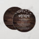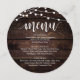 Moderne rustikale Hütte Dunkelbraunes Holz, Streichellichter, Rundschilder, Abendmenü für Hochzeiten. Ein perfektes Bar für Ihren großen Tag. Sie können die Schriftart-Farben des Skripts ändern und den Menüinhalt und die Schriftart entsprechend Ihren Bedürfnissen ändern.