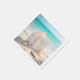 Eine leere Karte und eine Erholung auf einem Sandstrand, umgeben von Muscheln, Seestern und türkisfarbenem Meereshintergrund. Alle Texte können geändert werden.