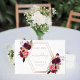 Ein weißer Hintergrund, Rose goldener Folientext. Sie sind mit geometrischen Rahmen und Blumenarten in Bordeaux und Rosa dekoriert. Personalisieren und fügen Sie Ihre Namen und das Hochzeitstermin.