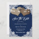 Navy Bule rustikale Hochzeit Save the Date Karte mit Burpherzen auf einem hessischen Hintergrund mit weißem Blumenriss und Saitenleuchten dekoriert.