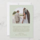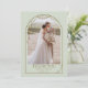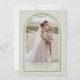 Diese Hochzeitskarte mit einem vergoldeten Rahmen aus Perlenbogen, einem bogenförmigen Foto auf der Vorderseite und einem kleinen gewölbten Foto auf der Rückseite. Personalisieren Sie den benutzerdefinierten Text oben. Matching-Elemente verfügbar.