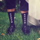 Dress die Männer deiner Hochzeitsfeier mit der Koordinierung der personalisierten schwarzen Socken. "Groom" ist vorne auf den Socken in fett weißer Typografie niedergeschrieben. Personalisieren Sie diese Souvenir-Sake-Socken mit Ihren Vornamen und Hochzeitsdatum in einfacher weißer Typografie.