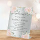Ein Begrüßungs-/Programm, ein Timeline-Poster für eine Hochzeit. Stilvolle Imitat mit silberfarbenem Hintergrund, die mit rosafarbenen und weißen Blume geschmückt sind. Personalisieren und fügen Sie Ihre Namen und die Details. Schwarze Buchstaben.