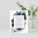 Das Design besticht durch einen eleganten Blumenkranz in Aquarelltönen, der mit Pfannkuchen, Rose, Eukalyptuspflanzen und mehr in marineblau, grün und Elfenbeintönen dekoriert ist. Das Design verfügt auch über eine silbergraue Druckbox unter dem Kranz mit modernem Schriftart - Textlayout. Eine passende Blumenanordnung wird auf der Rückseite hinzugefügt, um das Gesamtmotiv zu übernehmen. Sie können zusätzliche Informationen auf der Rückseite hinzufügen oder einen der Texte komplett ändern, um Ihre Bedürfnisse zu Anzug zu bringen.