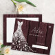 Weiß glänzende Diamanten Hochzeitskleid auf einem dunkelburgundischen Holzboden, das eine schlichte, moderne, elegante Brautparty-Tipp-Karte macht.