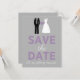 Hochzeitskleid und Tuxedo Ankündigung Datum freihalten lila. Ankündigen Sie Ihre bevorstehende Hochzeitsfeier auf niedliche und klassische Weise mit diesem bezaubernden Hochzeitskleid und Tux! Diese Save the Date Karte ist voller schicker, spielerischer Stil