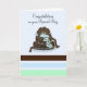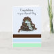Eine hübsche Schokolade und ein blauer Hochzeitstorte mit einem großen schokoladenbraunen Bogen mit weißen Polka-Punkten und hübschen blauen kaskadenförmigen Blume. Drei Streifen in der Farbkoordinierung betonen den Boden. Passen Sie das Innere mit Ihrer eigenen Nachricht an oder verließ, wie es ist.