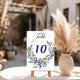 Ein eleganter weißer Hintergrund mit violettem, lavendelfarbenem und eukalyptusgrünem Dekor. Personalisieren und Ihre Tischnummern. Schwarze und lila Buchstaben.